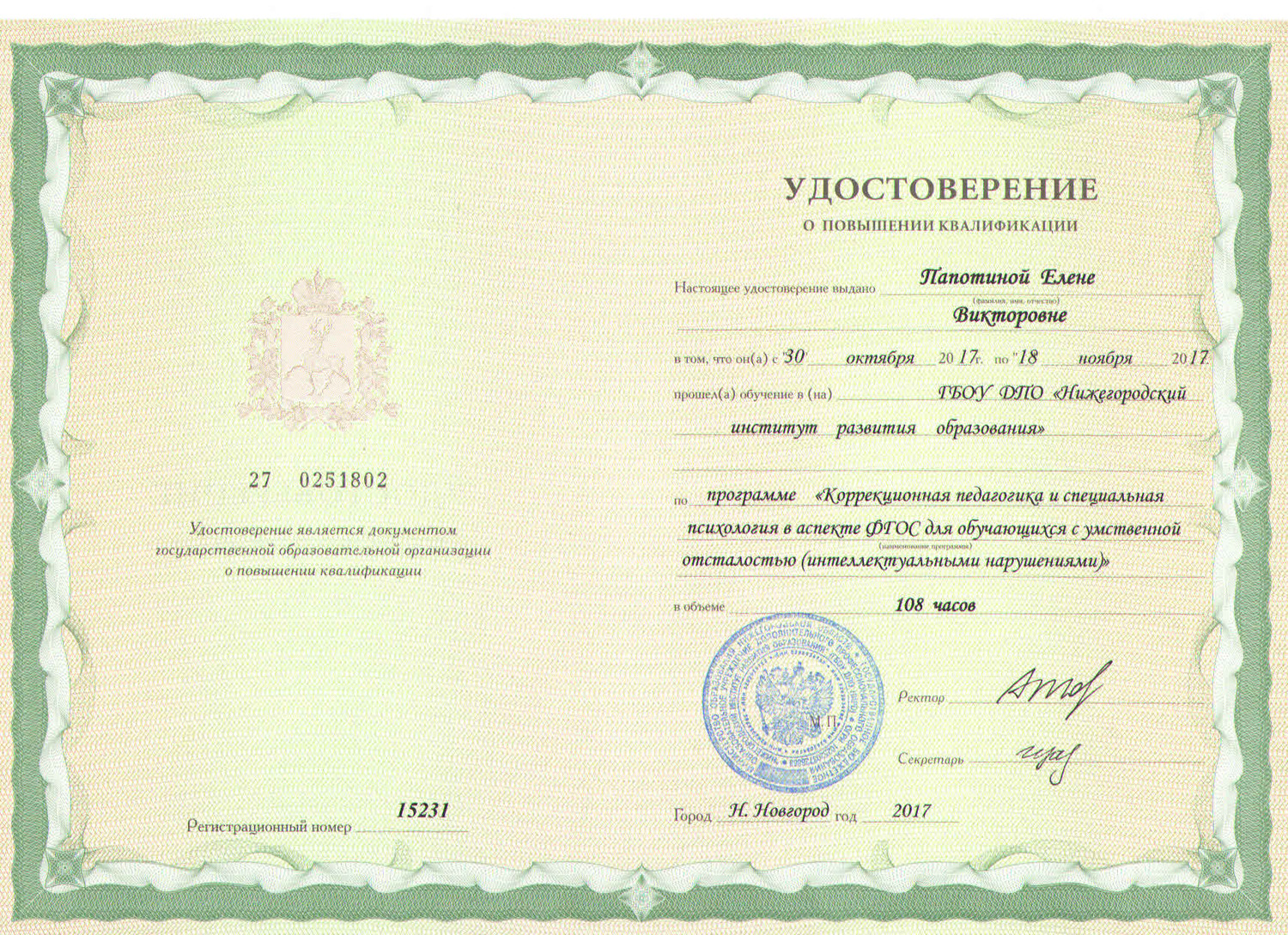 | 8. ГБОУ ДПО "Нижегородский институт развития образования" по программе "Коррекционная педагогика и специальная психология в аспекте ФГОС для обучающихся с умственной отсталостью (интеллектуальными нарушениями)", 108 часов, 2017 год |