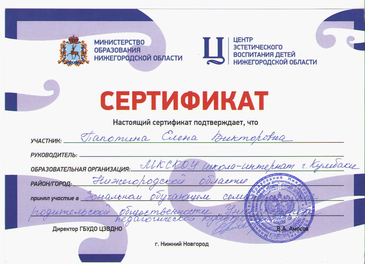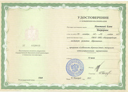 1. ГБОУ ДПО «Нижегородский институт развития образования», курсы повышения квалификации «Особенности обучения детей с тяжелыми интеллектуальными нарушениями», 72 часа, 2015 год.