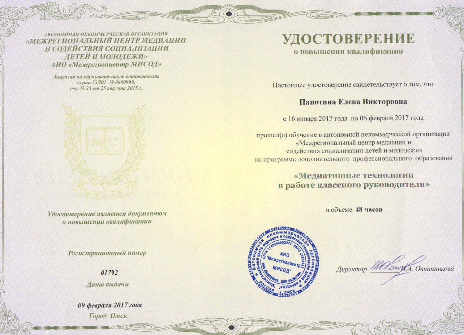 | 5."Межрегиональный центр медиации и содействия социализации детей и молодежи" по программе дополнительного профессионального образования "Медиативные технологии в работе классного руководителя", 48 часов, февраль 2017 |