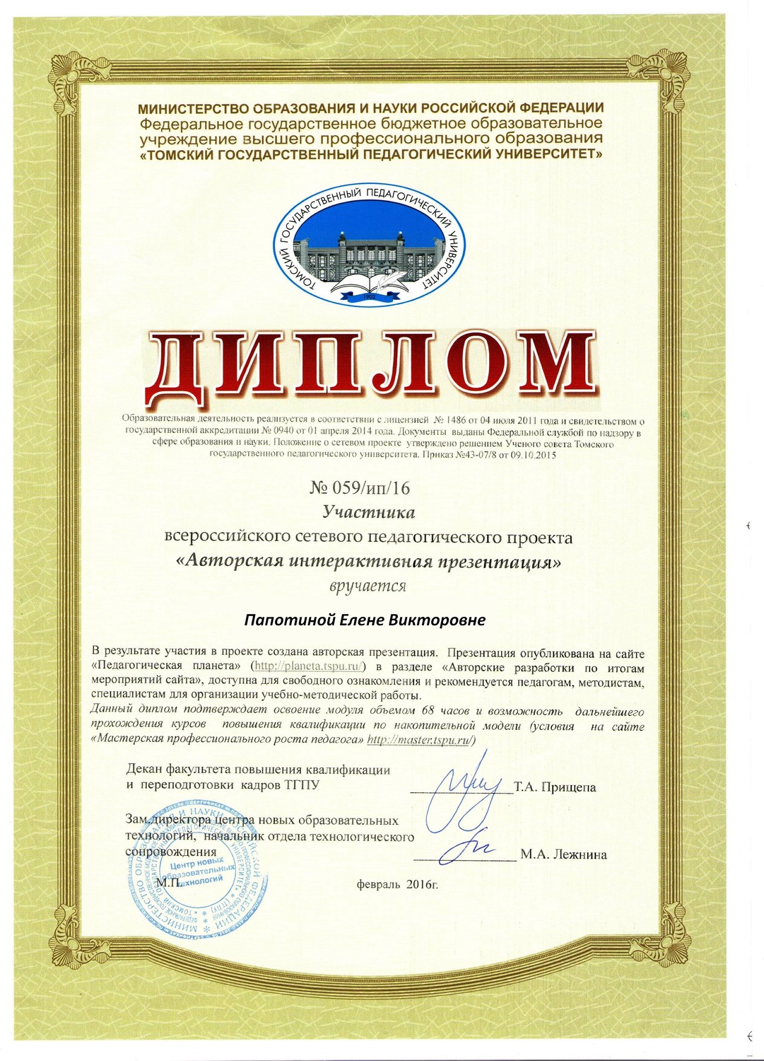 | 2. Всероссийский сетевой педагогический проект "Авторская интерактивная презентация", 68 часов, февраль 2016 года |