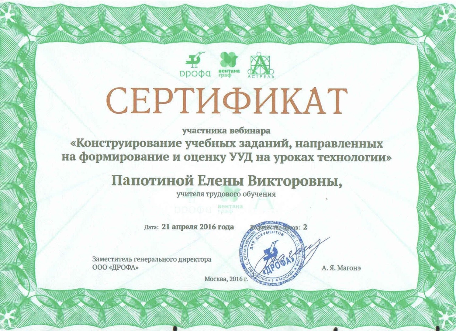 | 3. Вебинар "Конструирование учебных заданий, направленных на формирование и оценку УУД на уроках технологии", 2 часа, 21 апреля 2016 года |