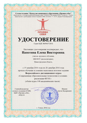 | 4. Центр дистанционного образования "Прояви себя", дистанционные курсы - "Современные образовательные технологии в условиях ФГОС", 108 часов, 2016 год |